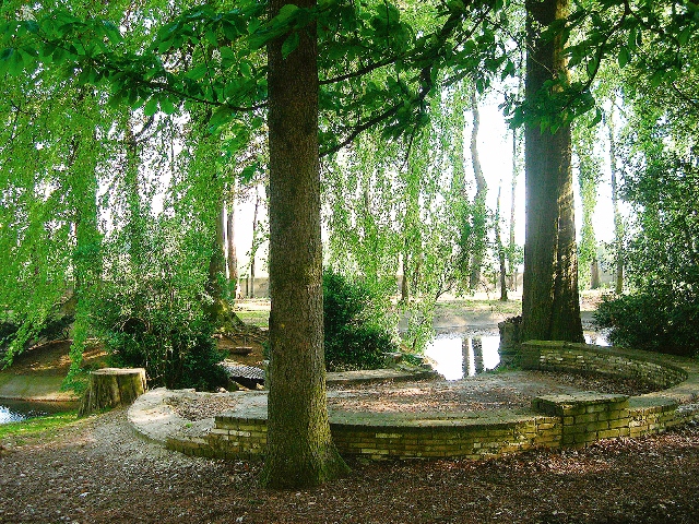 Door de bouw van het houten prefabgebouw dat als 'bezinningscentrum' dienstdoet en de nivelleringswerken die daaraan voorafgingen, werden de vista en de beplantingen van het middengedeelte van de tuin grotendeels vernietigd. In deze zone komt bijna niets anders voor dan hoge opslag van robinia (Robinia pseudoacacia) en gewone esdoorn (Acer pseudoplatanus).