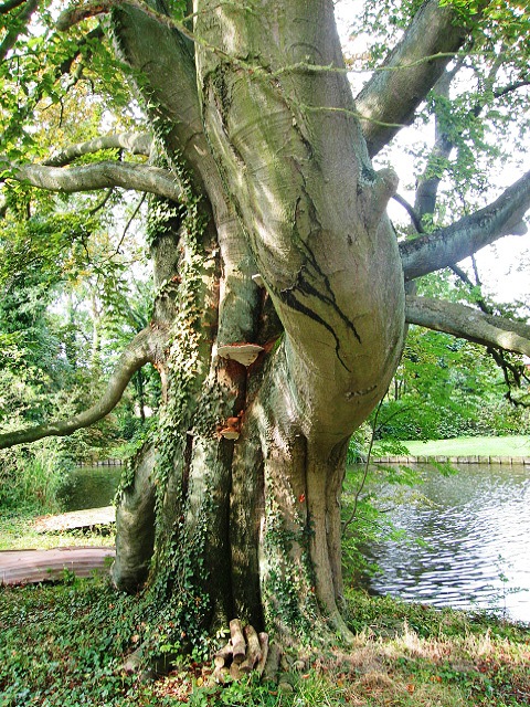 Hof ter Spelt, sculpturale bruine beuk op de binnenoever van de ringracht, wellicht een 'bundelboom' (Deneef, Roger, 01-09-2005, ©Vlaamse Gemeenschap)