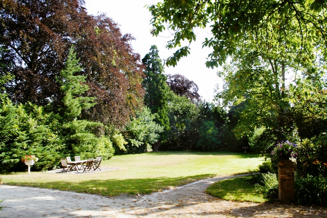 Vanaf de straat verschijnt het huis achter een soort ere-erf met de nu grotendeels verharde oprit. Het wordt ingelijst door een bontbladige esdoorn (Acer pseudoplatanus 'Leopoldii') en een oude maar gehavende tamme kastanje (Castanea sativa), vermoedelijk de enige boom uit de 19de eeuw. Links, in de hoek van de Dorpsstraat waar het vroegere huis stond, ligt een beplantingsheuveltje met vijf taxussen (Taxus baccata). Twee derde van de tuin bevindt zich achter het huis en is aangelegd volgens een beproefd recept: een langgerekt gazon begrensd door een rondweg en een in vorm en kleur gevarieerde hoogstammige beplanting, die uit de tijd van Persoons dateert (stamomtrekken tot 317 centimeter): resten van een rij bruine beuken (Fagus sylvatica 'Atropunicea') die de tuin afbakende, wierook cipres (Calocedrus decurrens), rode bastaardpaardenkastanje (Aesculus x carnea), goudbonte Ierse taxus (Taxus baccata 'Fastigiata Aureomarginata') etc. De struiketage is eveneens gevarieerd en bestaat uit courante soorten: een geschoren massief van laurierkers (Prunus laurocerasus), diverse soorten rododendron, kardinaalshoed (Euonymus alatus), boerenjasmijn (Philadelphus coronarius), diverse soorten spirea, een oud exemplaar Chinese blauweregen (Wisteria sinensis) enzomeer. Bij de recente aanplantingen: sikkelcipres (Cryptomeria japonica) en Japanse vingeresdoorn met diep ingesneden blad (Acer palmatum 'Nicholsonni'). In de verste uithoek van de tuin staat op een hoge sokkel de vrouwelijke incarnatie van 'Architectura', die met kritische blik het gebouw in de verte monstert. In deze hoek is er een tweede heuveltje, waar vermoedelijk ooit een paviljoen of prieel heeft gestaan.