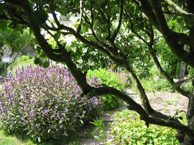 Du jardin situé sur les remparts de la vieille ville il ne restait plus rien sauf un vieux pommier. En étoile autour de sa ramure, Nicole Quilliot a conçu des parcelles à thème, comme jadis, comportant des plantes ornementales, historiques, alimentaires, condimentaires ou médicinales, dans le but de sauvegarder un patrimoine végétal.