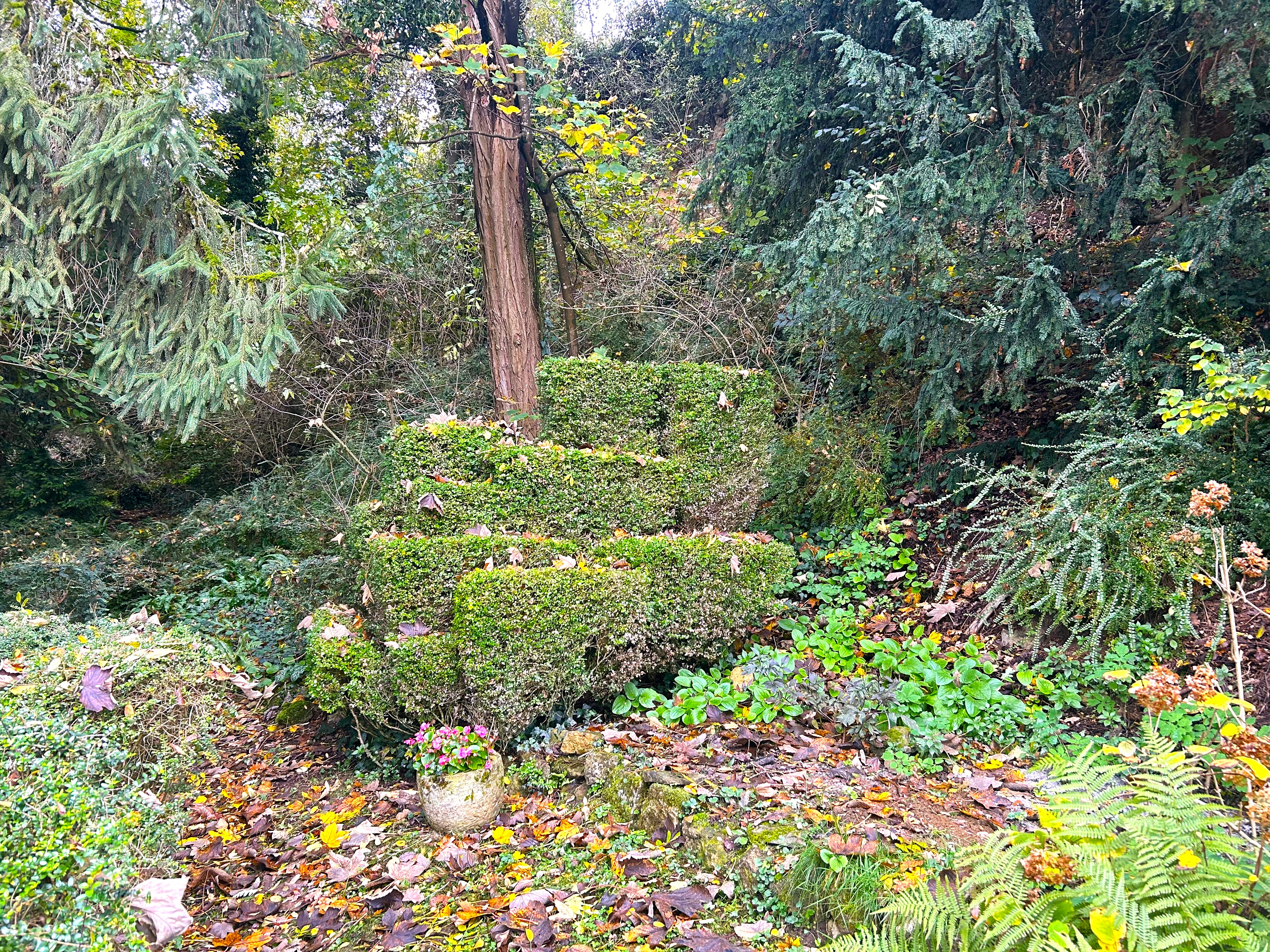 En contrebas, l’exceptionnel et monumental buis taillé en gradins déjà en place début 20ème assure la transition de la partie escarpée découverte attenante à la maison avec le sous-bois et la forêt.