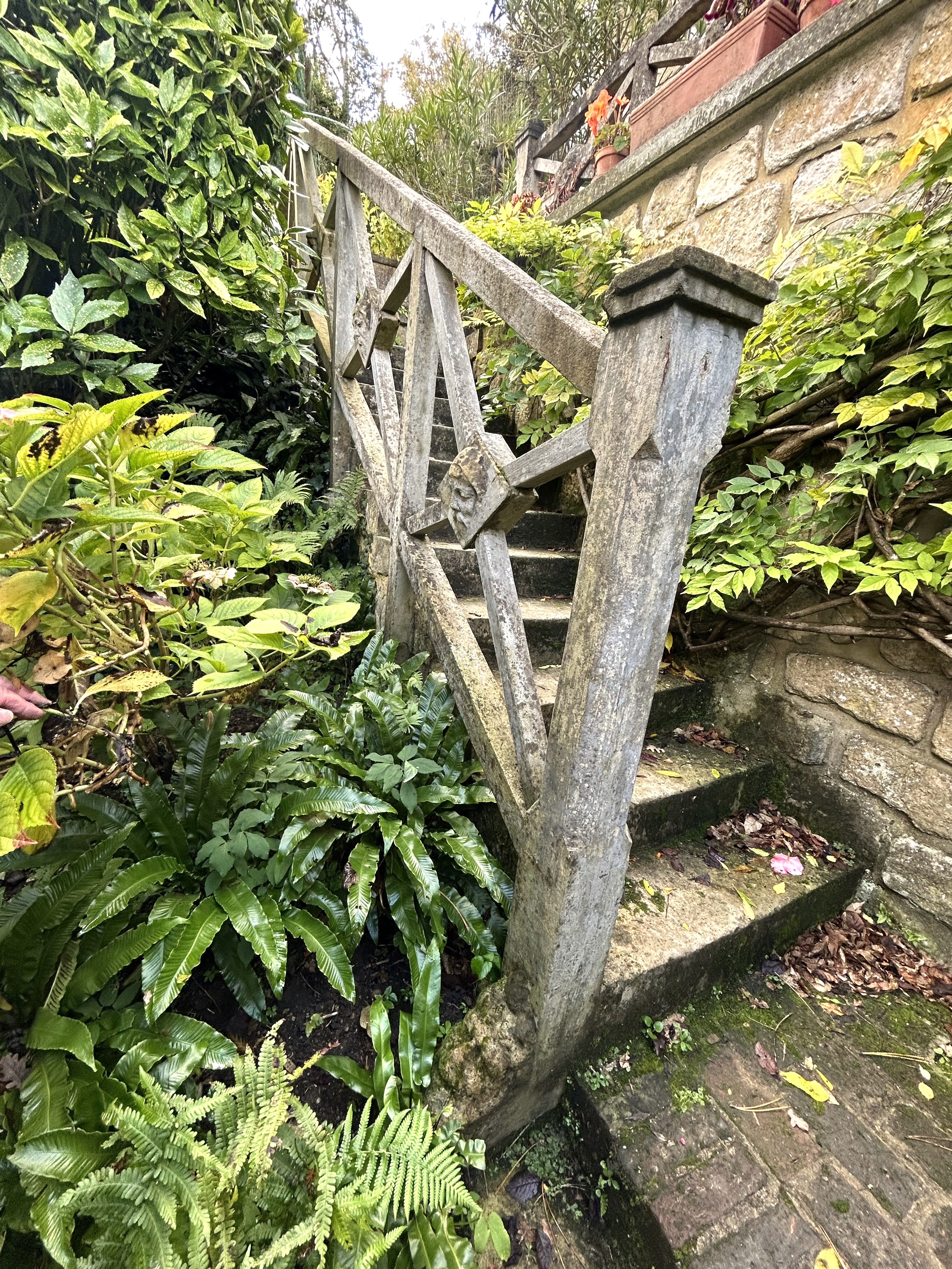 Le jardin donne le ton dès l’entrée de la propriété dans un esprit romantique où règne en harmonie architecture (fontaine, statue) et nature (fougères, sous-bois humide, couvre-sols) dominés par l’escalier et son garde-corps en pierre reconstituée de ciment imitant le bois. Cette construction à décor géométrique assortie à la balustrade de la terrasse, tous deux ornés de mascarons laissent à penser l’évolution d’un style rocaille vers un style rustique plus stylisé en vigueur à cette époque (1890-1910).