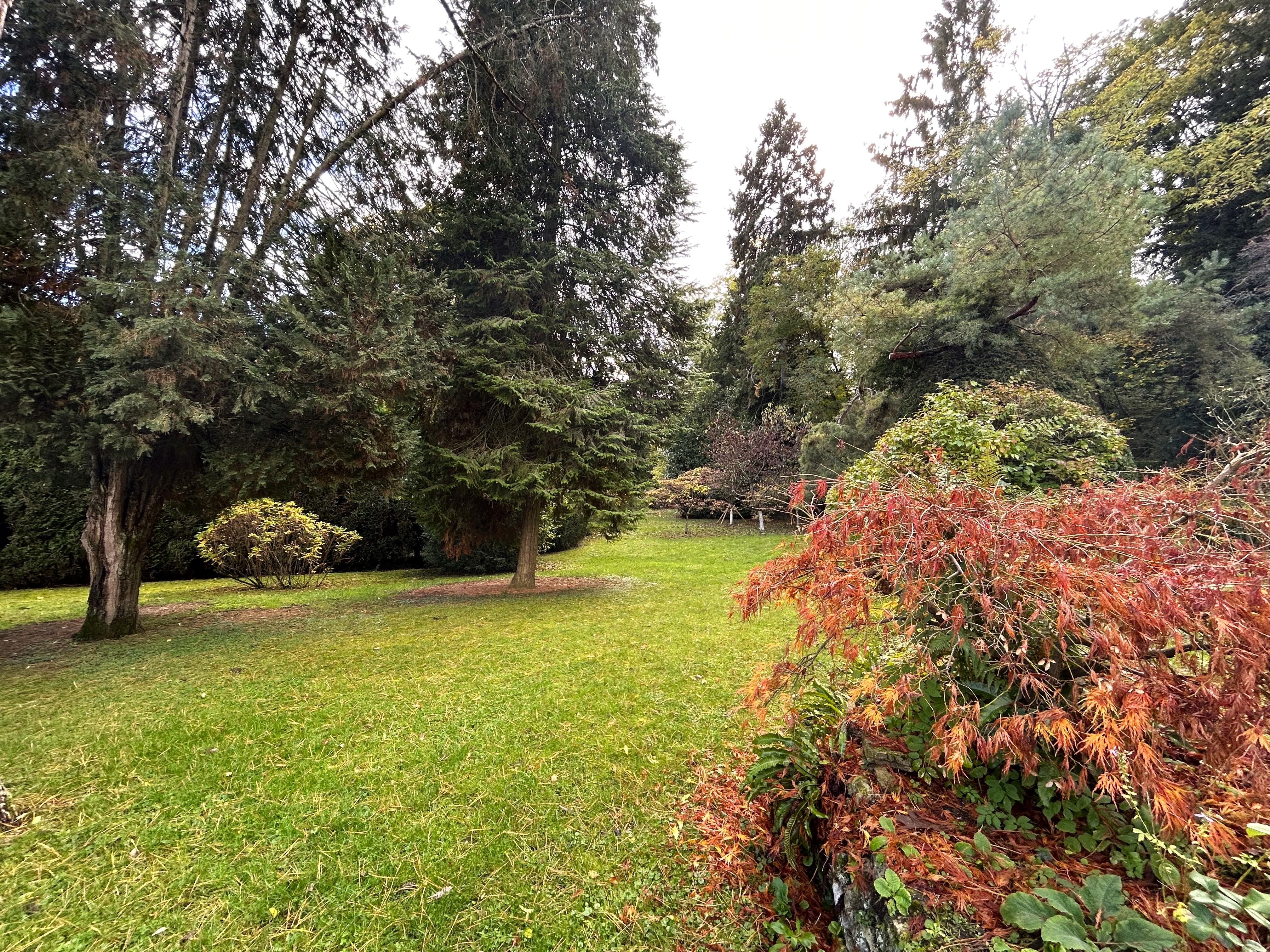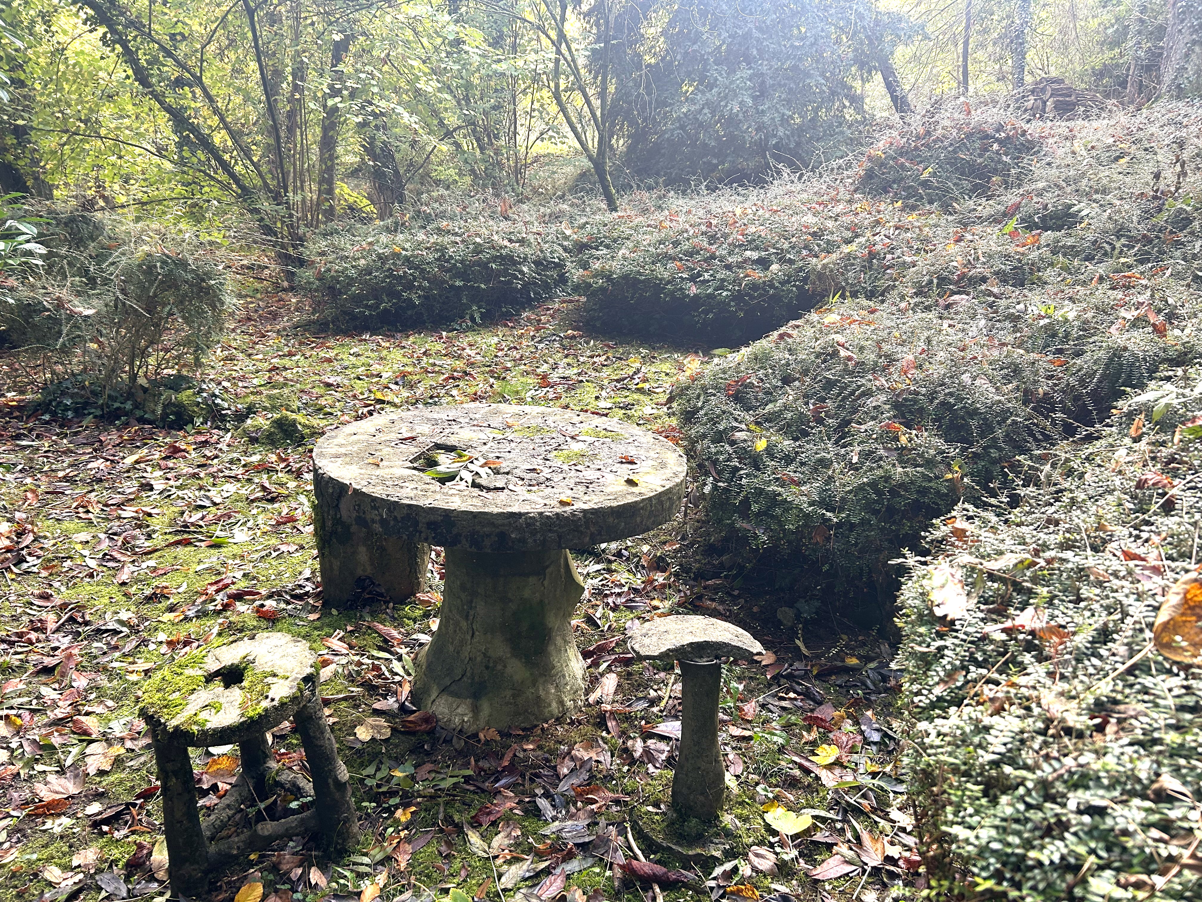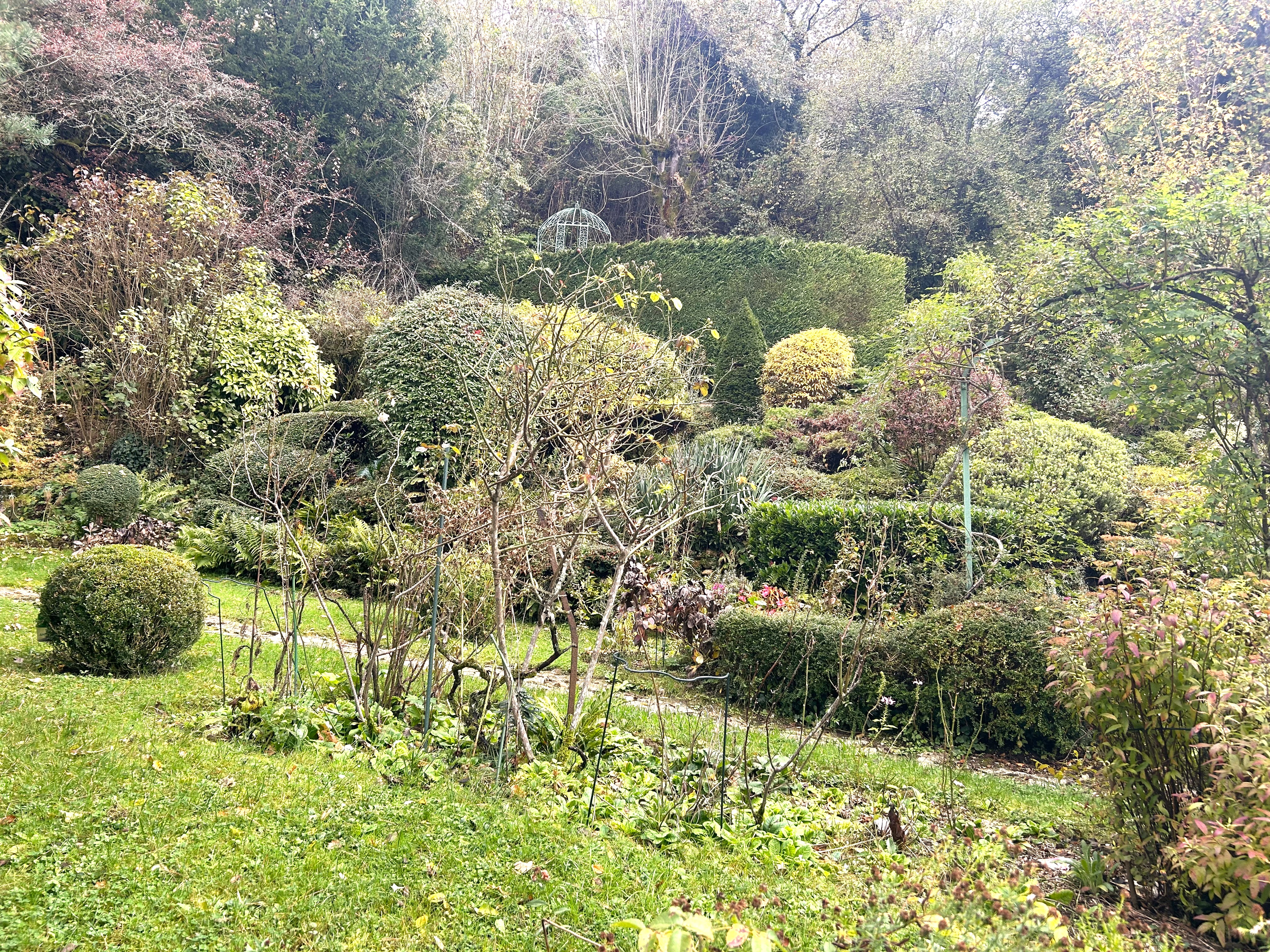 Le jardin d’origine qui jouxte la maison a conservé son tracé escarpé accueillant une grande variété d’arbustes et de vivaces savamment taillés, entrecoupés de haies de loniceras (buis commun). Dans cet heureux mélange, quelques plantes méditerranéennes acclimatées côtoient des plantes plus autochtones d’Ile-de-France. Encouragée par une exposition Sud-Est et un sol calcaire, la floraison s’étale au fil des saisons et offre à l’année un camaïeu de couleurs que l’on découvre du belvédère. La sente qui chemine vers le sous-bois en s’élargissant vers la partie forêt s’ouvre sur une belle clairière aménagée. Les vestiges d’un mobilier d’extérieur sculpté daté fin 19ème comprenant une table ronde et deux tabourets en rocaille de ciment en forme de champignons, imitant troncs et souches d’arbres, évoquent sans nul doute le goût pour le pittoresque tardif en vigueur à cette époque (1880-1910). L’objectif recherché de cet ensemble décoratif pouvait constituer en une mise en scène naturaliste intégrée au cadre végétal pour apporter un esprit romantique au sous-bois parcouru par les topiaires ou créer une pause champêtre propice à la contemplation.