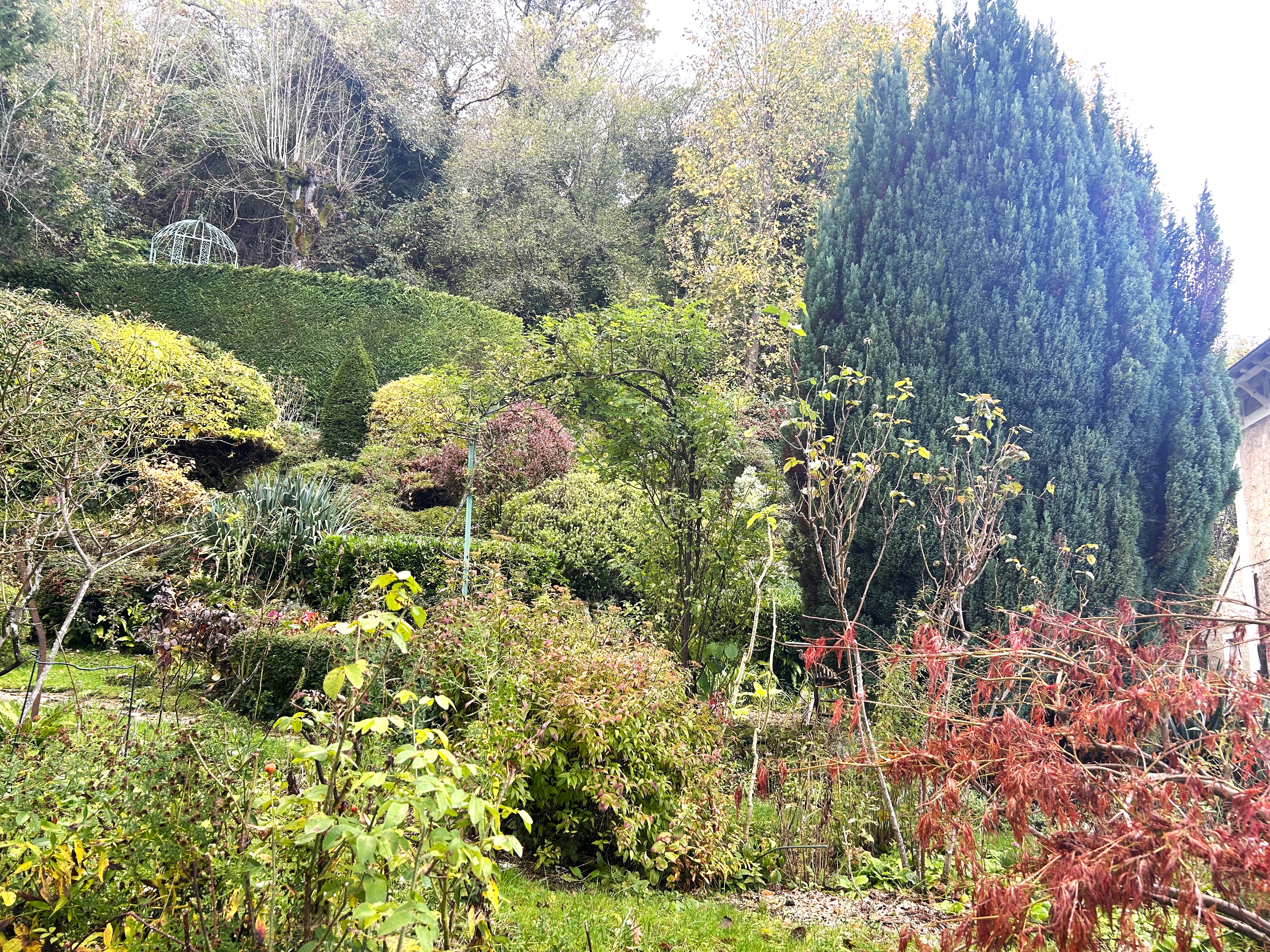 De belles et nombreuses essences d’arbres (marronniers, érables) à ports quelques peu enchevêtrés et dont certaines racines perchées accrochent la roche calcaire abrupte rendue incertaine par les épisodes pluvieux suivis de sécheresse ne sont pas sans rappeler les paysages d’Hubert Robert. La zone boisée autour de la propriété est protégée et il n’est pas rare d’apercevoir chevreuils dévalant les sentiers qui conduisent à la maison en quête de terrain de jeu et de jeunes plants tandis qu’écureuils roux affectionnent les conifères. Mésanges, grives musiciennes, moineaux, ramiers et merles contribuent à la biodiversité du site. Cependant, la plus belle vue sur le jardin et la vallée s’opère depuis la terrasse de la maison ou s’épanouissent en pots et jardinières italiennes, les annuelles renouvelées chaque saison, ainsi que des lauriers roses et rosiers grimpants. Quelle surprise également à l’arrière de la maison que la découverte d’un charmant jardin de cour parfaitement organisé abritant une belle collection de camélias en pot.