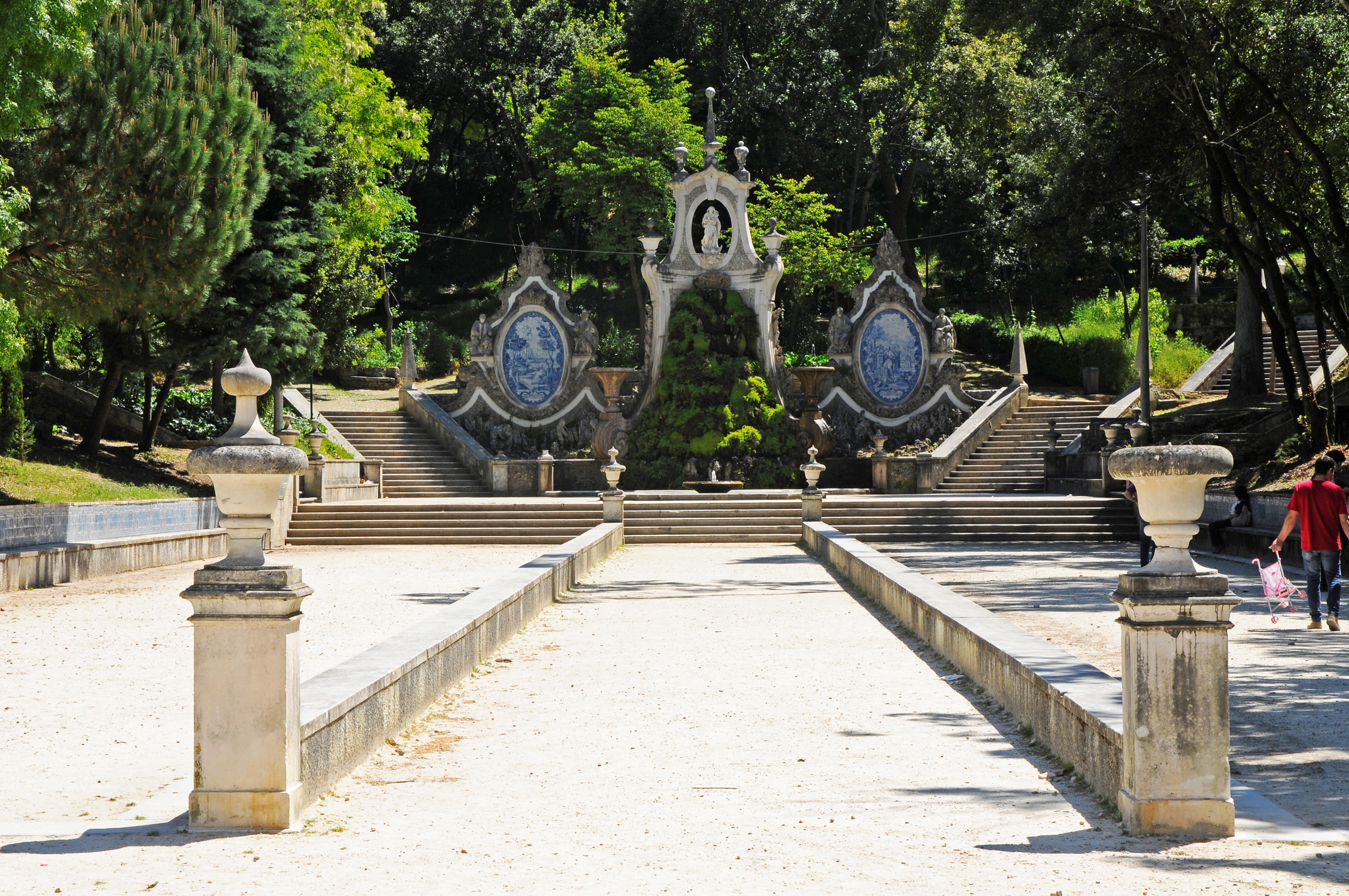 O jardim da Sereia no cimo da cerca, obra encomendada por Frei Gaspar da Encarnação e pago pelo Rei D. João V, introduz as regras europeias do barroco, os eixos de grandes dimensões, as fontes e cascatas de efeitos majestosos, mas troca os elementos decorativos mitológicos que nos jardins barrocos de toda a Europa se usavam pelos temas da religião católica. Se em Versailles o eixo principal do jardim aponta do palácio para a fonte de Latona, em Sta. Cruz dirige-se para a Cascata encimada pela imagem em jaspe de Nossa Senhora da Conceição, tendo de cada lado medalhões em azulejo com a figura dos evangelistas a escrever. A entrada no parque de Sta. Cruz é marcada por um arco triplo muito ornamentado enquadrando a perspetiva profunda do jogo da bola ou da péla. O jogo da péla era um terreiro onde se jogava com um bola em dois campos adversários ao longo do qual havia bancos corridos que, nos caso do Jardim da Sereia, eram decorados com painéis de azulejos. O eixo do jardim termina na grande cascata e divide-se em duas escadarias monumentais com 5 m de largura, totalmente simétricas, que sobem a encosta formando três linhas que se juntam e a que os desenhadores de jardins chamaram pied-de-poule, copiado de França por todas as cortes da Europa, do parque de Caserta em Nápoles ao sublime jardim de Peterhof em S. Petersburgo. A vegetação que existe já não é a mesma e o bosque em redor destes passeios e escadarias é denso e cobre a encosta inclinada. Subimos pela lado direito da cascata para admirar a qualidade desta obra e cada lance de escada termina num patamar com uma fonte ao centro, em concha ou em taça. O corrimão de pedra é ornamentado a cada ângulo por uma pirâmide de pedra. No cimo, a última fonte é um recanto onde uma parede revestida de pedra irregular calcária forma uma gruta com um tritão com barbas abrindo a boca a dois golfinhos e a quem chamaram sereia. Daqui nasceu a irónica designação de Jardim da Sereia. Descendo sobre a nossa direita uma ladeira que em tempos foi coberta por um túnel de loureiros descobrimos o grande lago circular. Esta peça é o ponto vital do jardim porque todo o sistema de repuxos das escadarias e da grande cascata é por ele alimentado. No centro do lago, numa ilha, foi plantada uma laranjeira e em redor do lago plantada uma sebe alta de ciprestes com arcos . Toda esta composição vegetal desapareceu e os bancos que encostavam à sebe de ciprestes flutuam tristes num espaço agora mal resolvido onde se veem ainda os cepos dos ciprestes cortados. A vegetação é um dos pontos que este parque público descurou e que certamente era o enlevo dos frades. À parte os dois pavilhões amansardados da entrada e os bancos que ladeiam o jogo da Bola, ambos recentemente restaurados, o sistema de água, os passeios e a estatuária do jardim da Sereia encontram-se num estado de degradação que se deve sobretudo ao vandalismo noturno. (Castel-Branco, 2014)